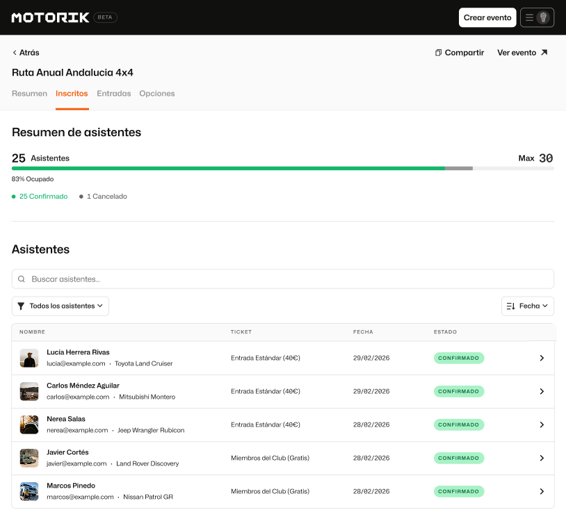 Controla inscripciones, pagos y comunicación con tus asistentes de forma segura con Stripe.