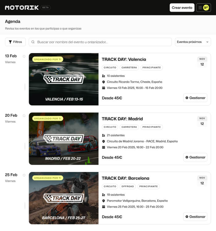 Encuentra eventos de motos, coches, quads y karts adaptados a tus intereses.